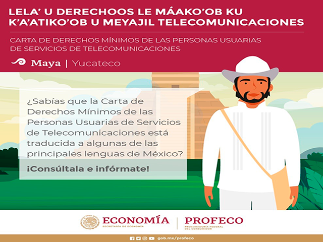 La Procuraduría Federal del Consumidor (Profeco), con el apoyo del Instituto Nacional de Lenguas Indígenas (INALI), lanza la traducción de la Carta de los Derechos Mínimos de los Usuarios de Servicios de Telecomunicaciones, en cinco lenguas indígenas nacionales.