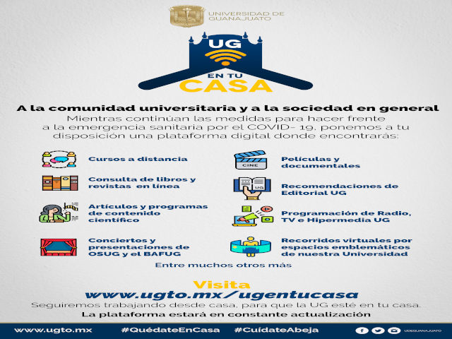 Con estas acciones, la Universidad de Guanajuato acerca a los guanajuatenses su quehacer académico, científico y cultural al tiempo que se suma a las acciones emitidas por las autoridades correspondientes para evitar la propagación del Covid-19.