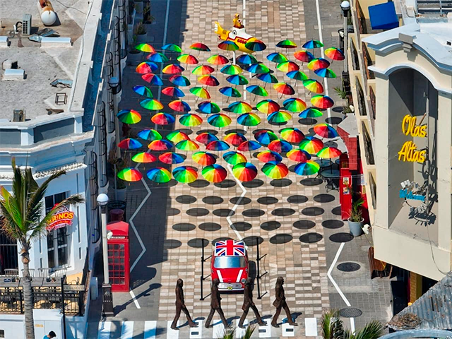A lo largo del callejón, también se encuentran distintos elementos que rinden homenaje a la banda, como una réplica de la fachada del The Cavern Club, donde iniciaron su trayectoria; un submarino amarillo, en alusión a “Yellow Submarine”, una de sus canciones más famosas; una cabina telefónica londinense de color rojo; un Mini Cooper clásico, símbolo de modernidad y estilo británico, así como murales y carteles de conciertos de la década de los sesenta. En conjunto, construyen una experiencia que integra música, arte y ambiente costero.